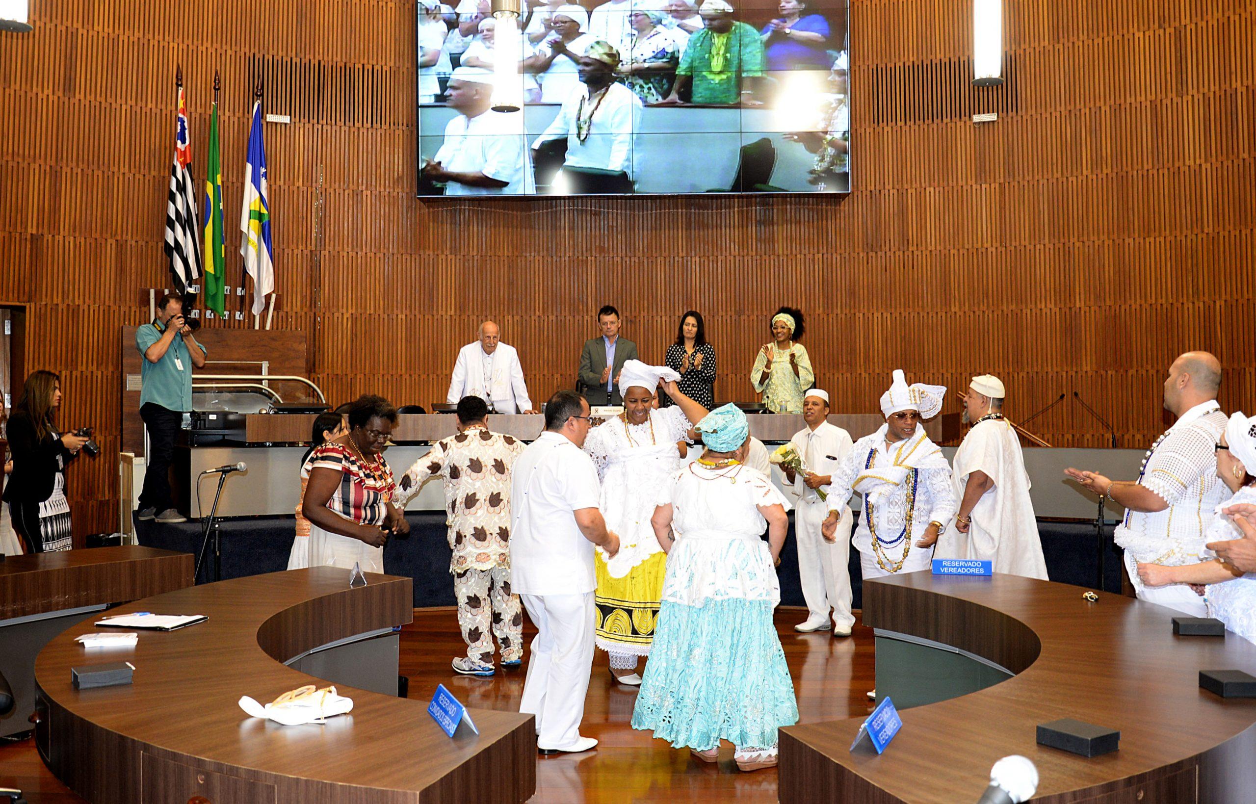 Num início de noite ainda ensolarada por causa do horário de verão a Câmara Municipal de Santo André teve a honra de receber umbandistas e candomblecistas para a comemoração do Dia Nacional da Umbanda. Em meio a pureza do branco havia uma profusão de cores e estampas deixando o recinto alegremente solene.