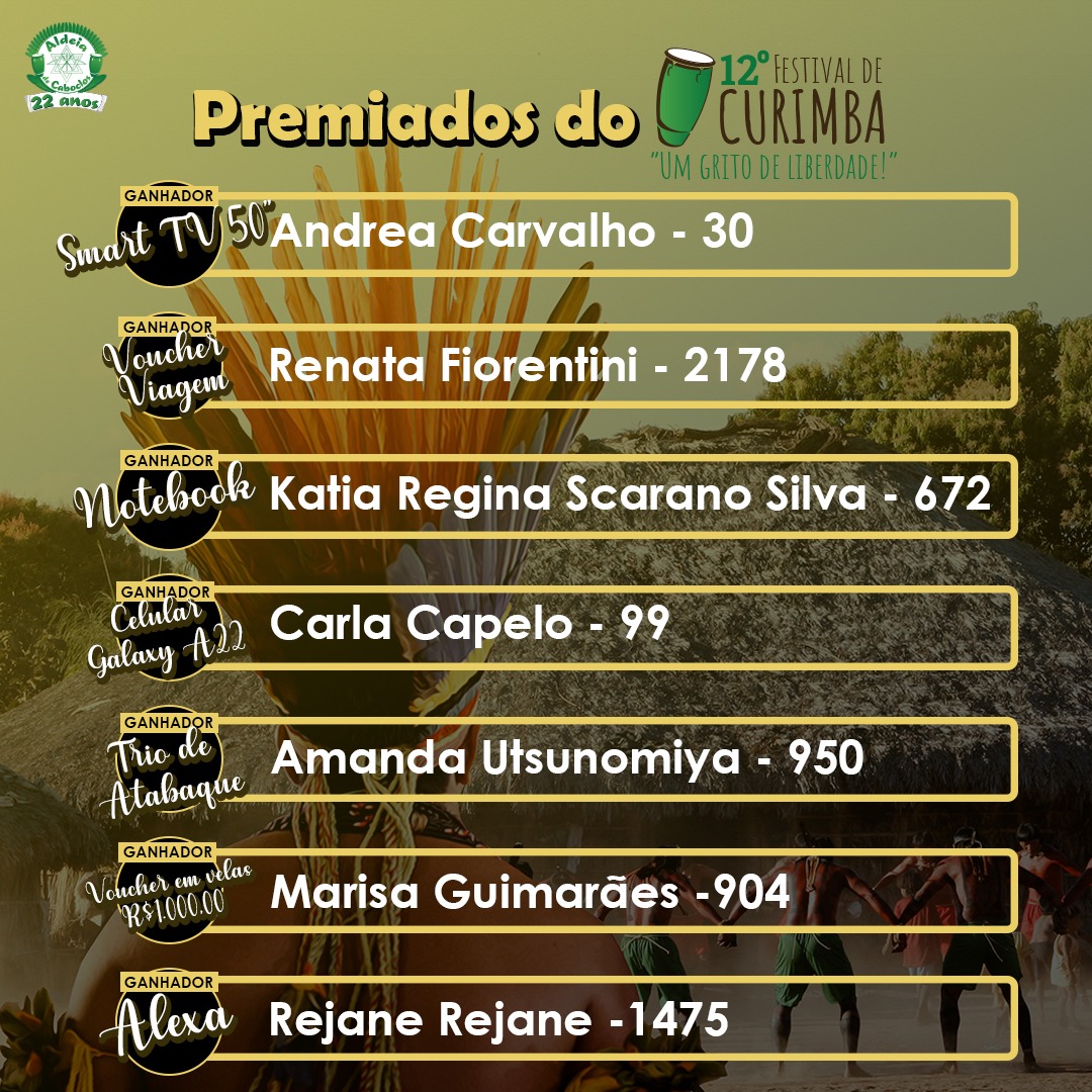 Apresentamos os felizardos ganhadores dos tão almejados prêmios sorteados neste marcante e empolgante Festival de Curimba: