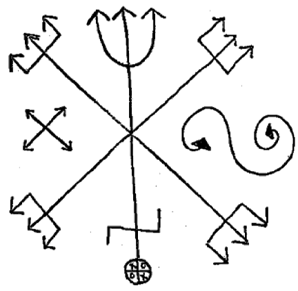 O assentamento de Exu Lucero Mundo é denominado de prenda. Os traçados riscados com giz, quando não iguais, muito semelhantes aos pontos riscados de Umbanda, são chamadas de firmas. Eis a firma de Lucero Kalunga: